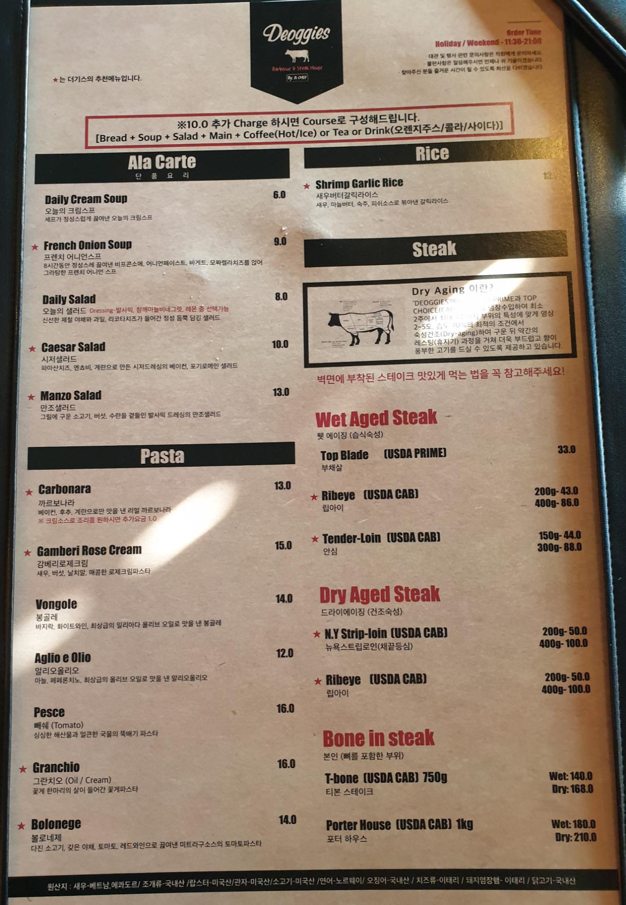 개인적으로 스테이크가 최최최최최고로 맛있는 집! 이 집을 알기 전에는 스테이크 먹고 싶으면 아웃백을 갔으나 이 집을 안 뒤로부터는 한 시간 거리지만 여기에 와서 먹는다. 그정도로 맛있고 에이징을 하는 고기라 그런지 실패를 하지 않는다. 아웃백은 지점별로 또는 날짜별로 언제는 괜찮고 언제는 냄새 나서 못 먹고 하는 등 맛이 좀 일정하지가 않아서 모험을 해야 하는데 이 집은 5번 정도 가봤지만 아직 실패한 적이 한 번도 없다.